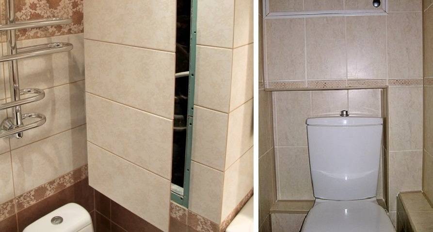 Они могут быть одностворчатыми и двустворчатыми, съемными или на петлях. Для удобного закрытия их можно сделать с замками, щеколдой, на магнитах. Грамотно смонтированные дверцы, совпадающие по отделке с коробом и стенами туалета, смотрятся очень красиво.