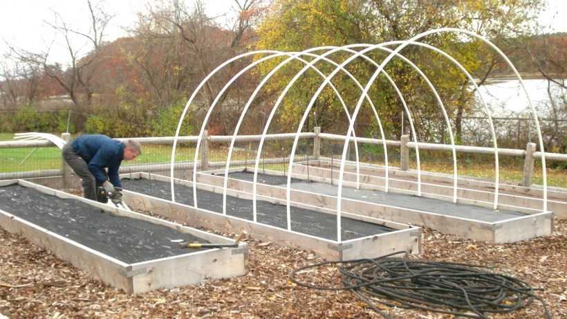 Чтобы правильно установить дуги, надо расположить их с шагом в половину метра. Ширину рассчитать несложно, это четыре ряда растений. Накрываем каркас полиэтиленовой плёнкой или другим укрывным материалом. Внизу фиксация покрытия обеспечивается тяжёлыми предметами. Между собой дуги крепятся проволокой или деревянными перемычками.