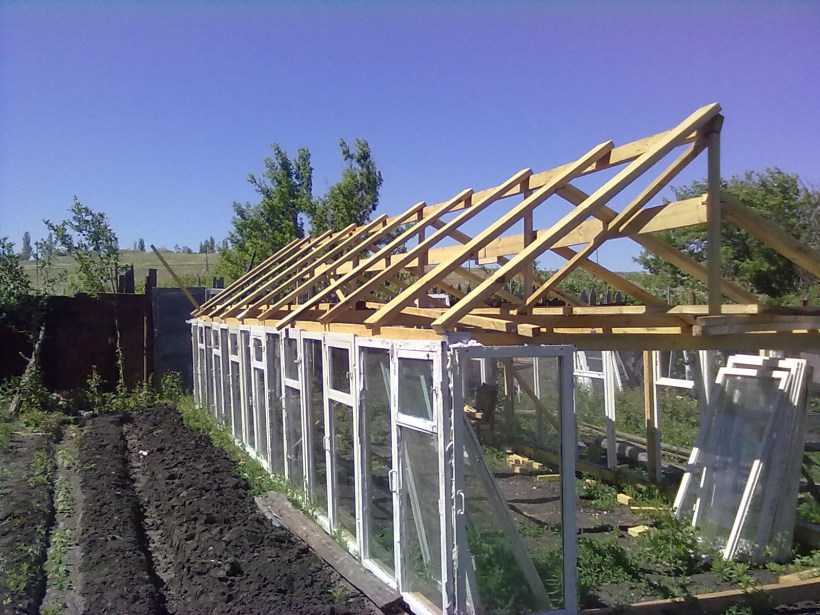 Когда все окна по периметру установлены, остается только заняться крышей. Её также можно изготовить из старых окон. Односкатной будет крыша или двускатной, должен решить сам мастер.