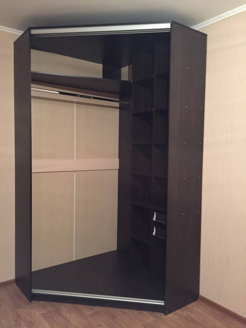 Размеры шкафа рассчитываются, исходя из возможностей пространства. Минимально возможной считается конструкция, занимающая 600˟600 мм от угла. Для достаточной ширины фасада (не менее 400 мм) глубина боковин не должна превышать 300 мм. Такой миниатюрный шкаф сопоставим по габаритам с навесным кухонным модулем и может быть оборудован только крючками для одежды и полками. Штанга в него уже не поместится.