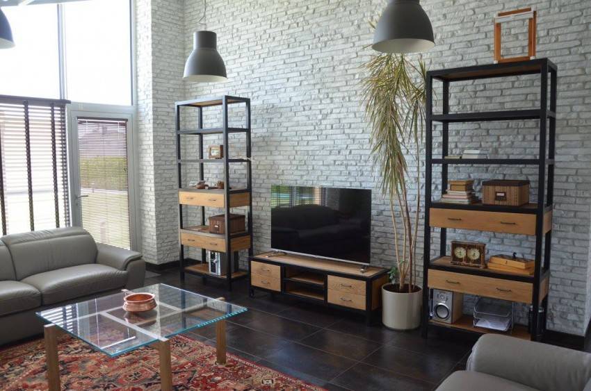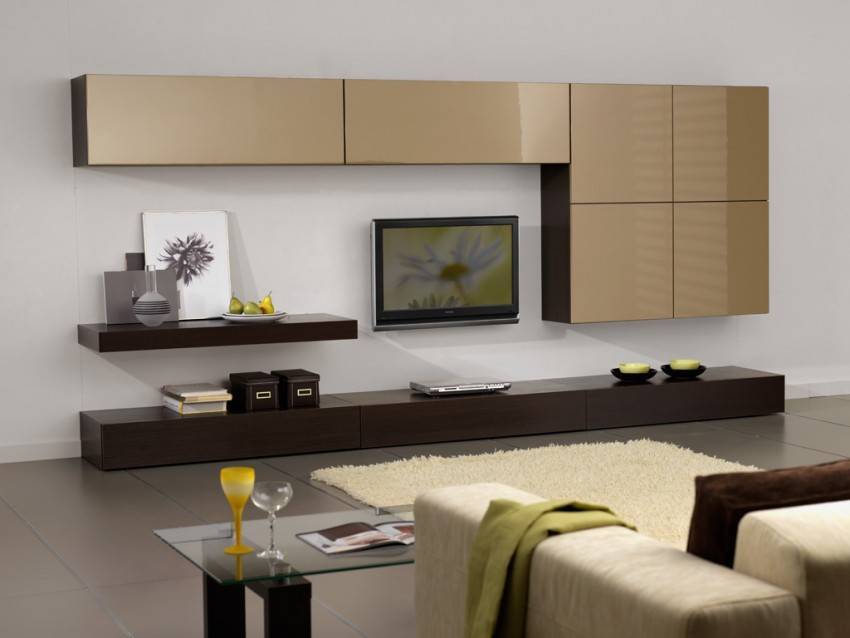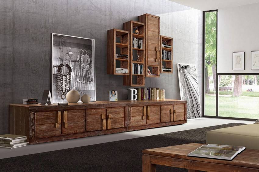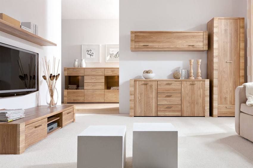 - в гостиных — массивные изделия с выдвижными отсеками или полками.
