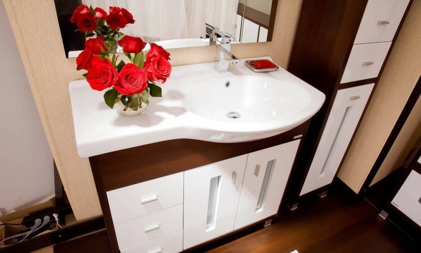 В условиях ограниченного пространства стоит предпочесть угловое или подвесное исполнение. При подборе дизайна и формы тумбы учитывается общий стиль помещения: