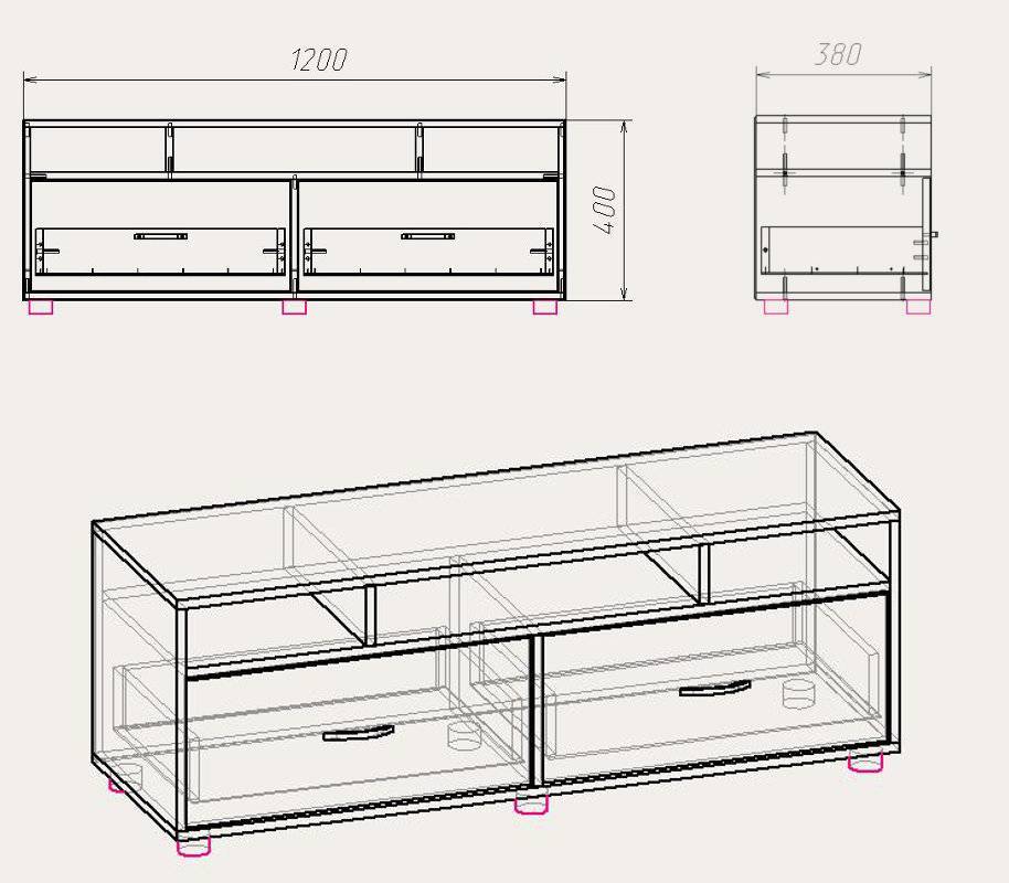 Зная габаритные размеры, создают чертежи и схемы будущей тумбочки. Удобнее всего их выполнять на миллиметровке. Для большей точности требуется три проекции: спереди, сверху, сбоку. Их вполне достаточно для отображения всех необходимых размеров. Если интересен угловой вид, то его легко будет построить путем пересечения линий с предыдущих ракурсов. Схемы дадут детальное представление о том, как сделать своими руками тумбу под телевизор