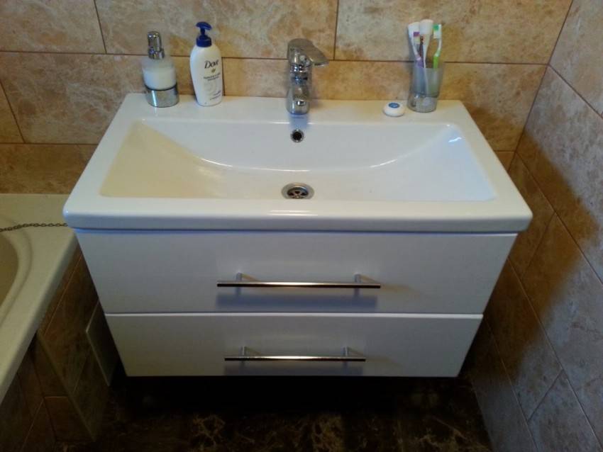 Непосредственно перед установкой емкости стоит положить на столешницу прокладку из пенополистирола. Она позволит компенсировать неровности на поверхности тумбы и защитит стекло от случайно попавших под днище абразивных веществ — песка или других мелких, но твердых частиц.