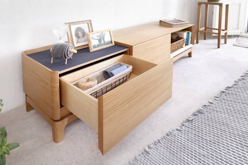 Если планируется хранить в тумбе много вещей, то ее можно сделать больше стандартных размеров. Тогда она одновременно будет выполнять функции компактного бельевого шкафа, туалетного и журнального столика. Чтобы решить вопрос функциональности мебели, определяются ее конструктивные элементы. Прежде всего, выбирается наполнение — ящики, полки, отсеки.