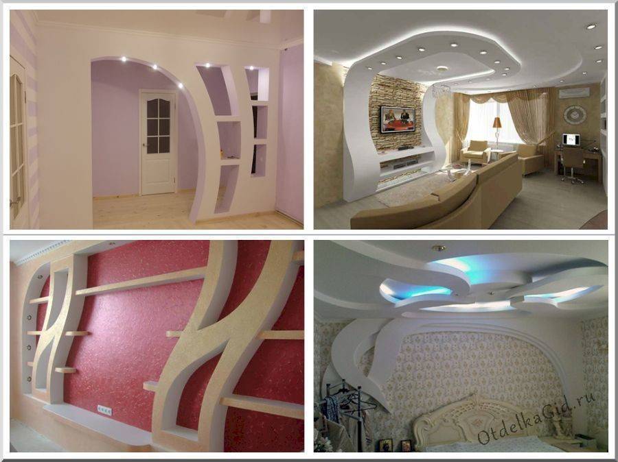 - фигурные элементы по типу арок или округленных форм. Также можно сделать рельефную конструкцию. Позволяют полностью изменить облик комнаты, перенести акценты и целиком изменить восприятие помещения.