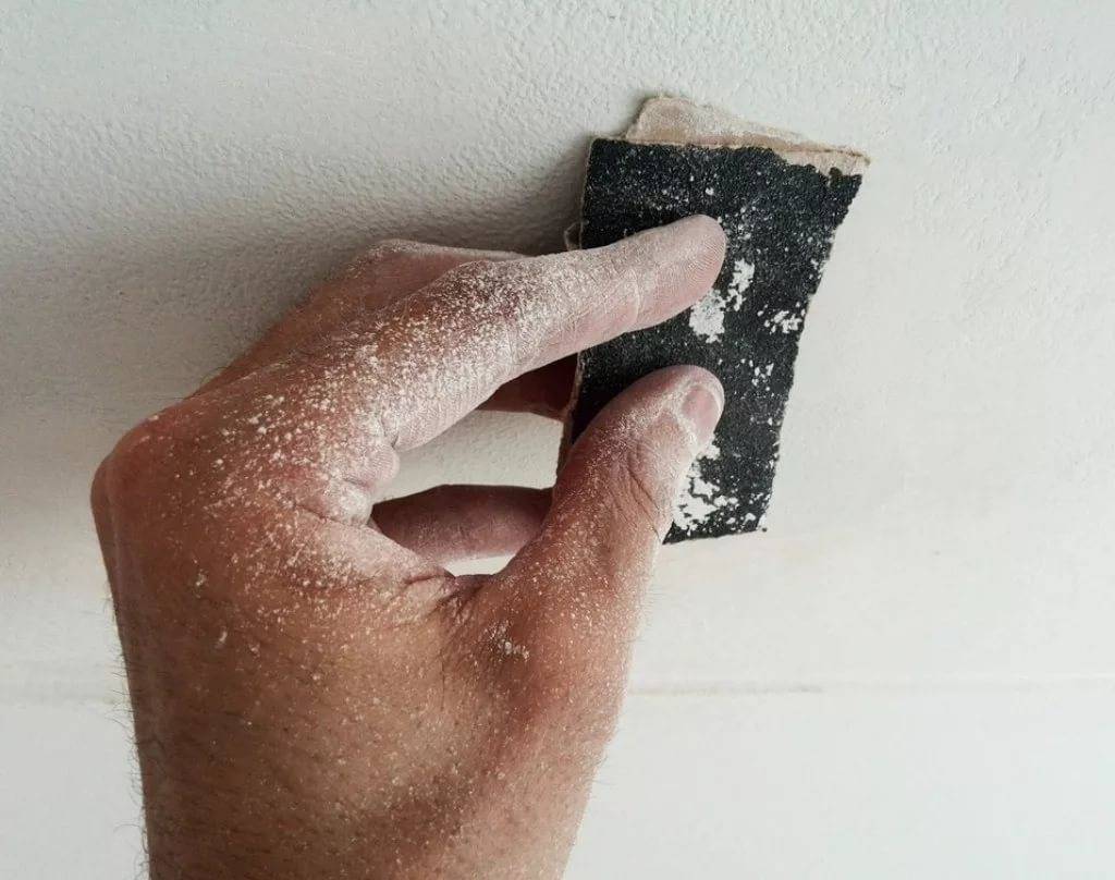 Высохший слой следует затирать наждачкой. Очищается поверхность от пыли, обработанные участки вновь грунтуют, и переходят к финишному шпатлеванию. Вновь проводится шлифовка и грунтование.