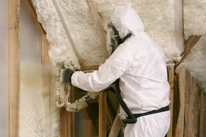 В качестве дорогостоящего, но идеально подходящего для этой цели варианта, можно рассмотреть напыление ППУ. Этот способ можно использовать как для утепления бани из пеноблоков изнутри, так и для строений из практически любых материалов