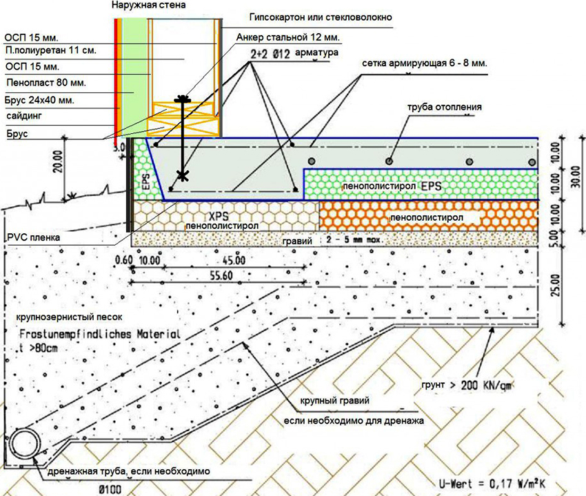 Также намного снижается риск возникновения коррозии арматурного каркаса бетонного фундамента. Кроме этого, наружный слой термоизоляции играет роль дополнительного заграждения от проникновения влаги в цоколь с подземной части фундамента в его стены и защищает саму изоляцию от наружных механических повреждений.