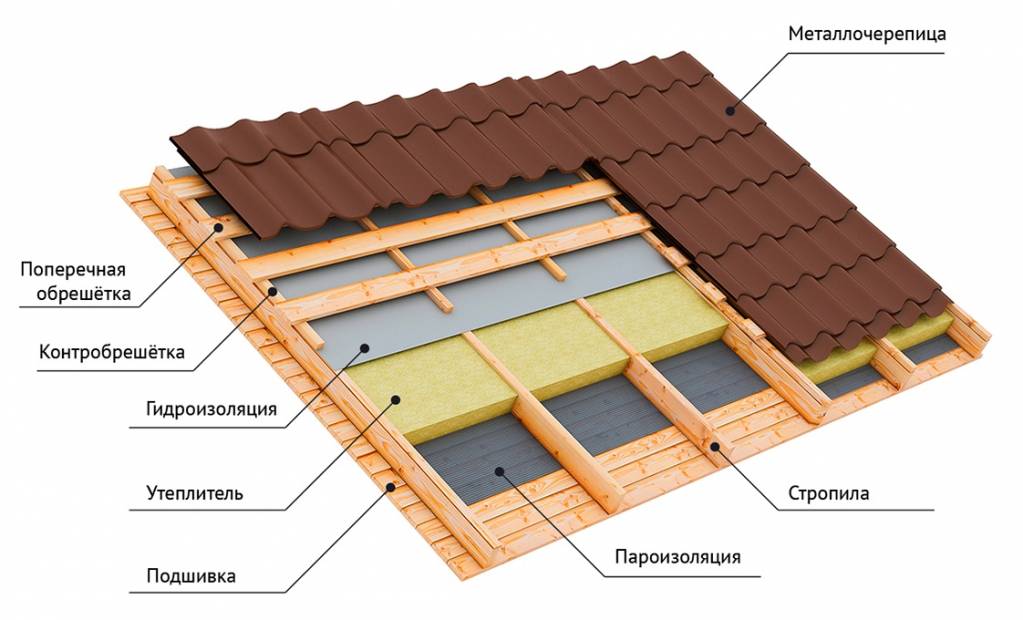 Отсутствует гидроизоляционная мембрана — листовая кровля просто уложена на обрешетке. При такой структуре утеплитель не будет защищен от возможных протечек и конденсата на внутренней поверхности кровельного покрытия (особенно критично для металлической кровли). Но и напрямую закрепить изнутри к обрешетке гидроизоляционную мембрану нельзя — нужна контробрешетка для создания вентилируемого зазора.