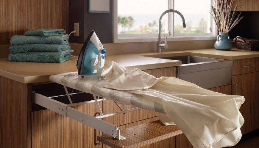 Для экономии места в современных квартирах и домах часто используется встраиваемая техника, гладильные доски в их числе. Это могут быть комплектующие блоки к стиральной машине или типа купе, закреплённые к стене и спрятанные за зеркальной поверхностью.