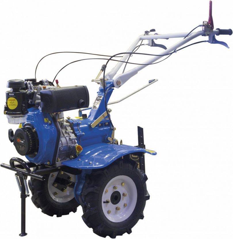 По нынешним временам интересное предложение: умеренная цена, удачный вес (86 кг), который и транспортировку не усложняет, но и обеспечивает достаточную нагрузку на колеса, чтобы обходиться без обязательных усилителей – потребуются они только при тяжелой работе. Двигатель здесь установлен собственного производства, Daewoo DAT 225-й серии. Он выдает 8 лошадиных сил при хорошем крутящем моменте на низких оборотах. Надежность у него более чем приличная, мотор вышел весьма удачным. Правда, обслуживать его не очень удобно, чем «болеют» многие мотоблоки – как всегда, подводит расположение сливной пробки. Редуктор – шестеренчатый, в чугунном картере. Ну, а раз уж и мотор имеет неплохую мощность, и редуктор не обделен прочностью, то и комплектные фрезы внушают – их можно установить до восьми штук, так что и с производительностью тут все нормально.