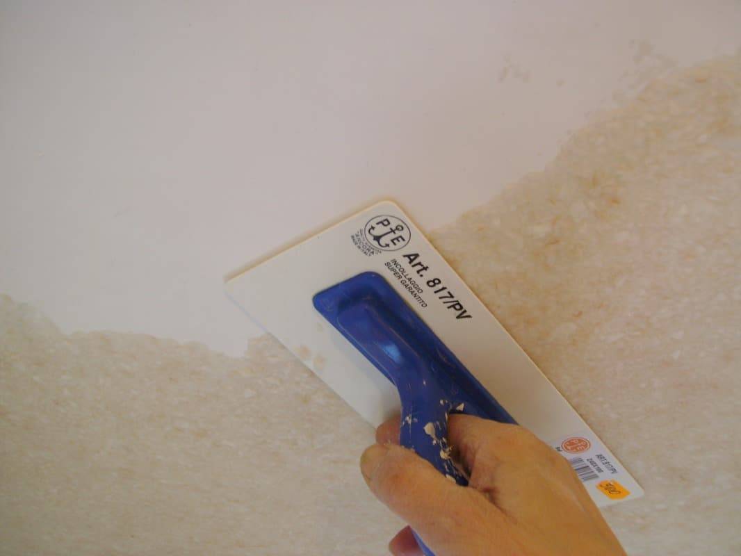 - Смесь набирается широким шпателем или теркой, наносится под небольшим углом. Уплотнять смесь не нужно, это нарушит рыхлость и дышащую способность обоев.