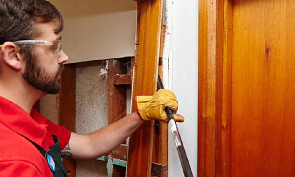 В первую очередь дверной проем освобождают от всего, что может помешать монтажу. Отдираются наличники и снимаются с петель створки двери. Деревянный брус дверной коробки распиливается ножовкой и демонтируется с помощью фомки. Весь периметр проема очищается шпателем и щеткой от старой отслаивающейся штукатурки и пыли.
