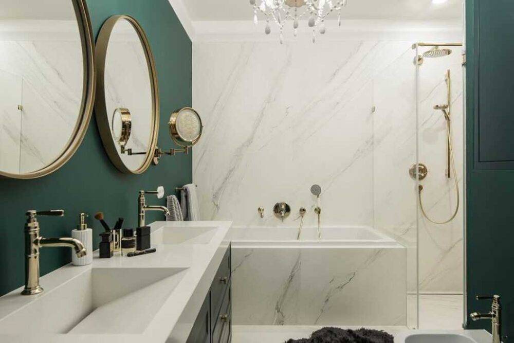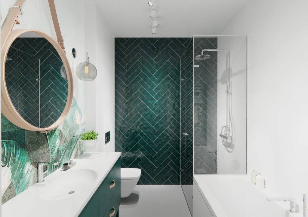 Цвет 2021 года определенно зеленый! Это бросает вызов популярному утверждению, что современная ванная комната — это просто приглушенные одно- или двухцветные пространства, в основном белые или серые.