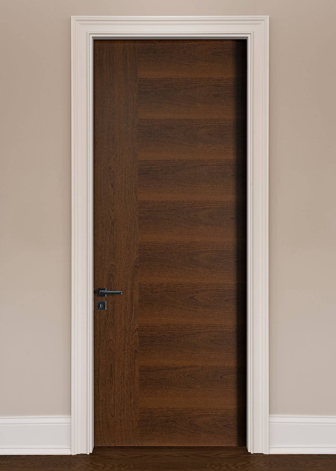 Сочетание темных дверных полотен и таких же стен не будет выглядеть мрачно, если скомбинировать их со светлым напольным покрытием. Это хорошее решение, к примеру, для спальни, если комната выходит окнами на восток и утром в ней слишком светло.