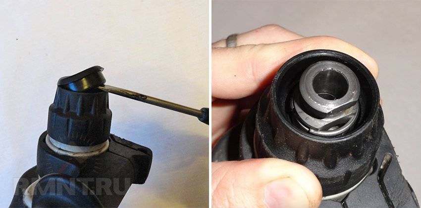 Чтобы разобрать патрон, нужно подковырнуть отвёрткой передний пыльник и снять со штуцера стопорное кольцо