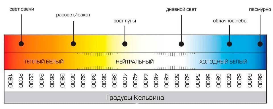 - цветопередача – оттенок света у источника излучения, измеряемая в Кельвинах;
