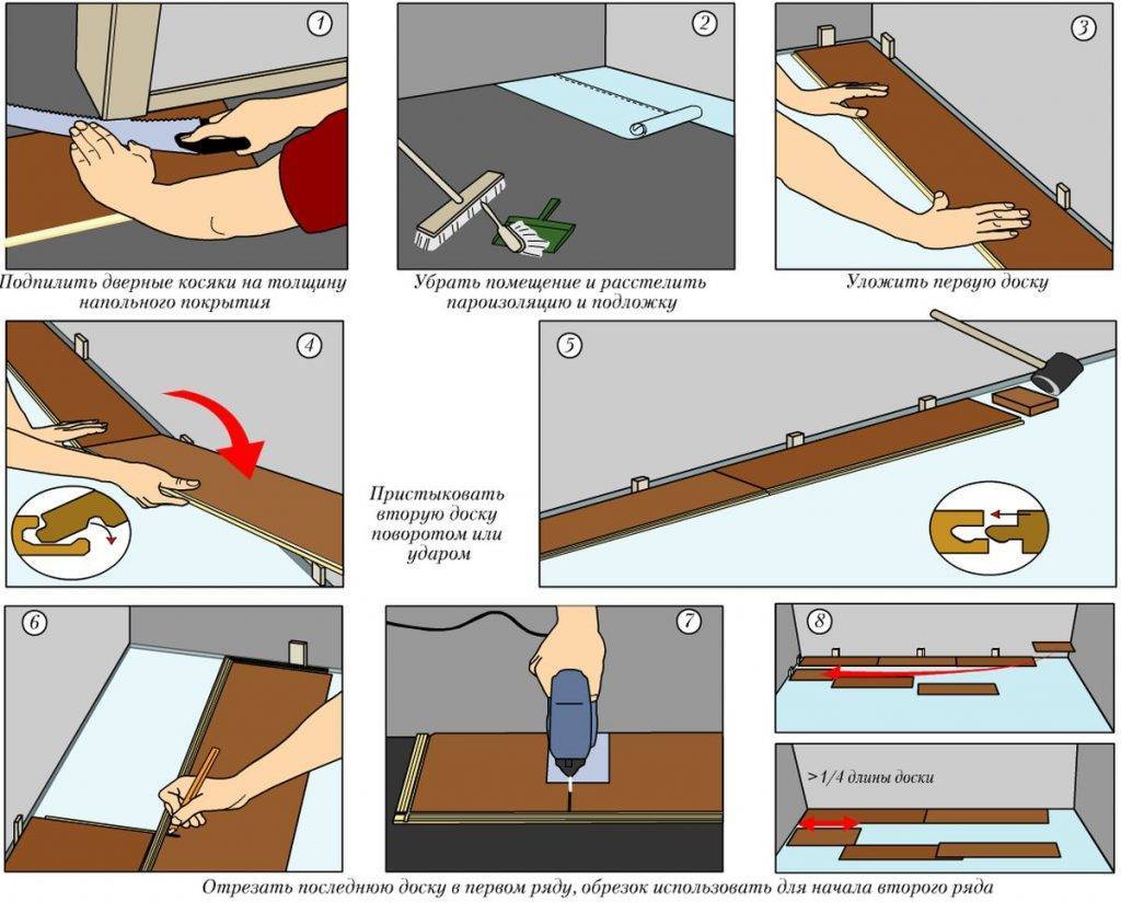 Если проводится укладка ламината своими руками пошаговая инструкция имеет некоторые отличия, которые будут вытекать из типа соединения элементов.