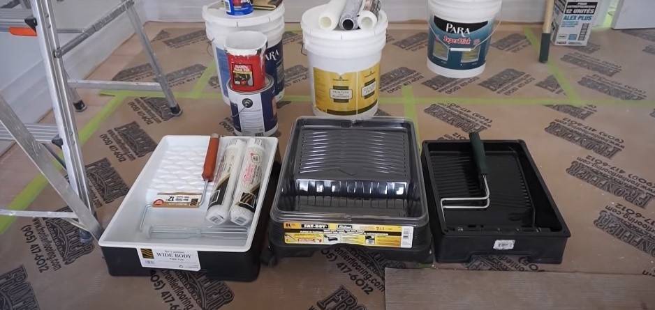 Непосредственно для окрашивания потребуются кисти и валики различной разных размеров и с различной шириной рабочей поверхности. Краску во время работы лучше наливать в ванночку, которую удобно ставить полочку стремянки.