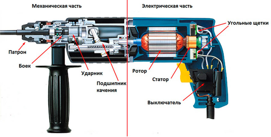 По своей сути, перфоратор — это машина для сверления, оснащенная ударным механизмом. Основное назначение данного прибора — разрушение твердых материалов, (кирпич, природный камень, бетон и пр.) создание в них пазов и отверстий. Большинство наших соотечественников ошибочно полагают, что ударная дрель и перфоратор — это одно и то же. Несмотря на схожее действие, инструменты имеют существенные различия, главное из которых кроется в конструкции ударного механизма: