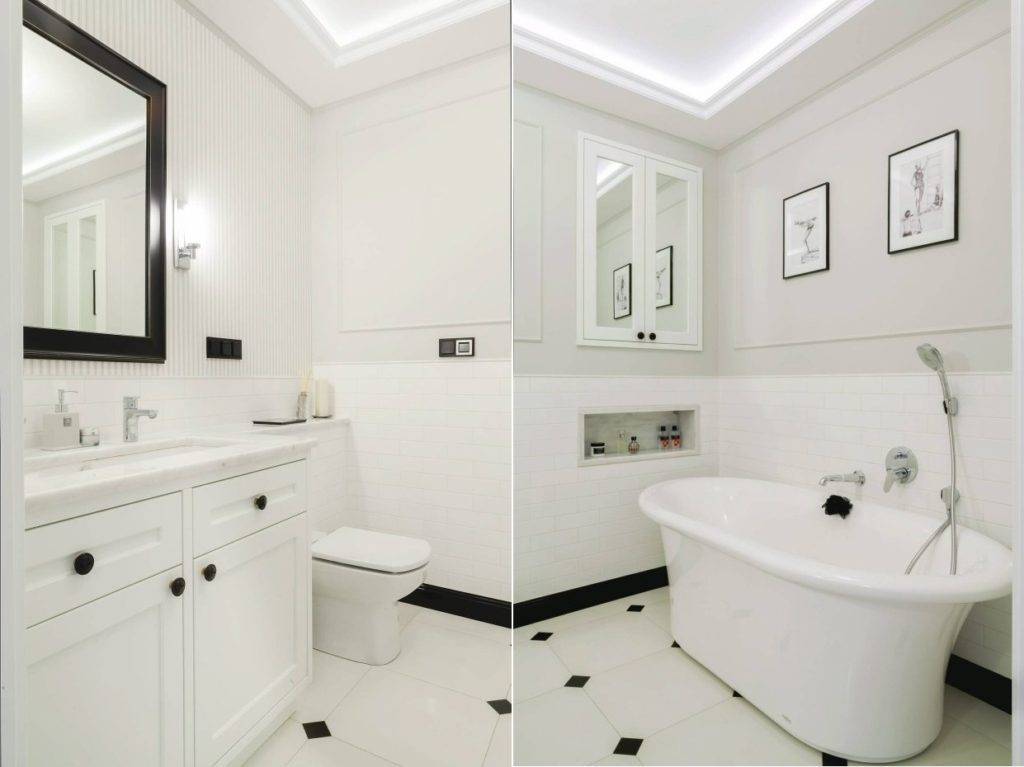 В настоящее время на рынке вы найдете этот тип продуктов в разных цветах — это создает дополнительное поле для экспериментов, например, окрашивание потолка в темный, черный или темно-синий, который будет хорошо контрастировать с белыми настенными плитками, расположенными до ¾ высоты помещения.