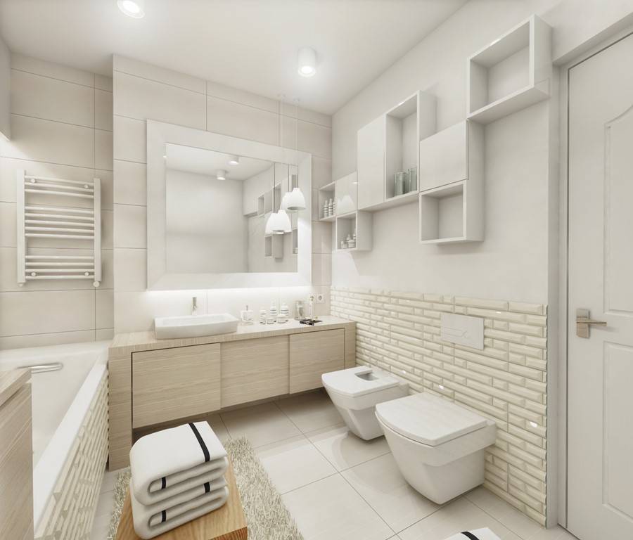 - Эффект упорядоченного и хорошо освещенного пространства — над зоной умывальника вы монтируете подвесной потолок из гипсокартона и окрашиваете его в чуть более темный цвет в зависимости от оттенка настенной плитки или пола. Для яркого эффекта не забывайте о нескольких плафонах или светодиодных полосах по всей поверхности.