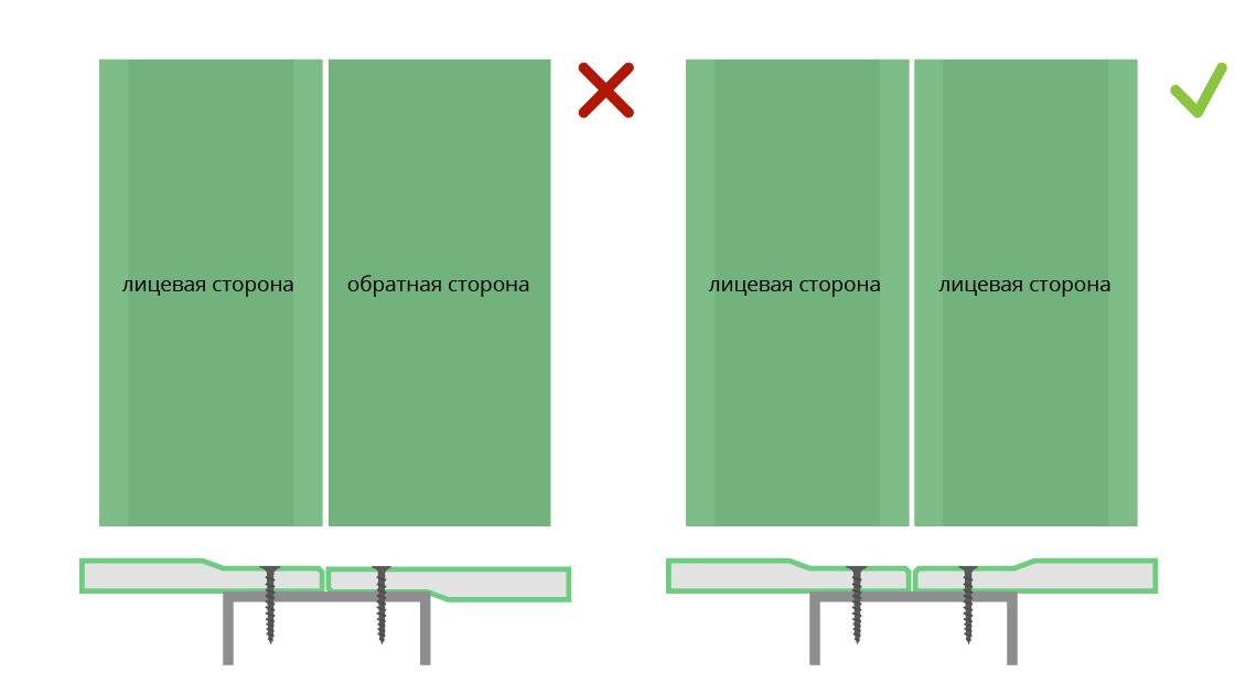 При монтаже важно крепить листы так, чтобы лицевая сторона была обращена в помещение. На лицевой стороне обычно нет никакой маркировки и она бывает немного шершавой, но главная особенность лицевой стороны состоит в том, что в эту сторону обращен заводские кромки