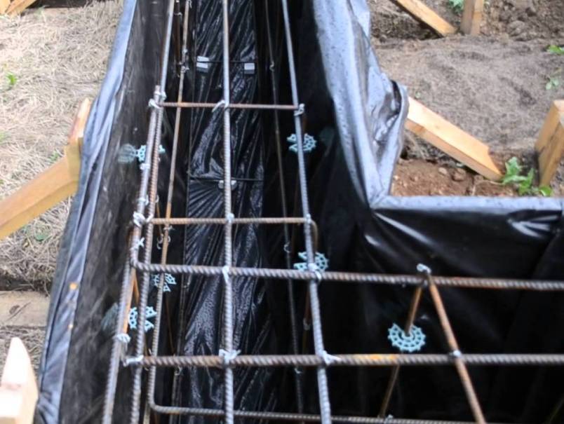 Перед установкой армирующего каркаса, на дно траншеи засыпается песок и проливается водой или трамбуется. Утрамбованную песчаную поверхность рекомендуется накрыть гидроизолирующим материалом или геотекстильным полотном. Это предотвратит поступление влаги к фундаменту и увеличит его надежность и эксплуатационный срок.