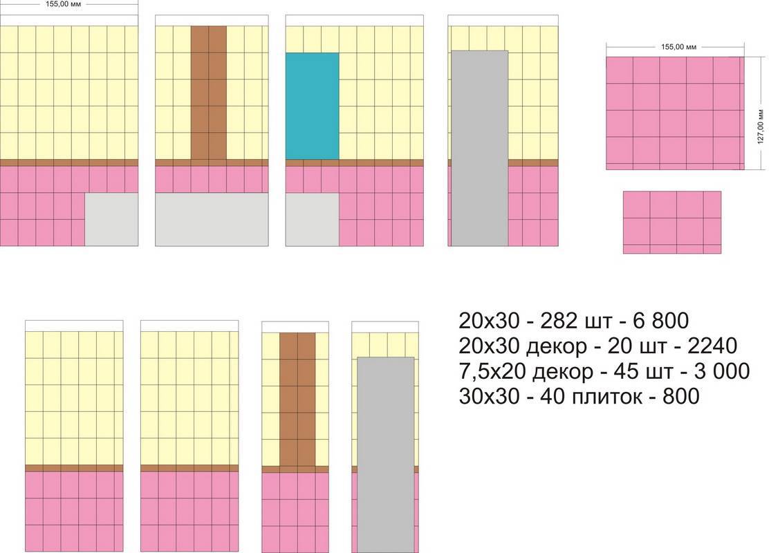 Наиболее точный и правильный, но потребует максимум усилий. Для расчета плитки в ванную комнату понадобится нарисовать каждую стену на бумаге в клетку или в любом графическом редакторе. Теперь прорисуйте каждую плиточку, сохраняя масштаб и, в идеале, учитывая зазоры в 1-5 мм. Заштрихуйте каждую плитку своим цветом, не забудьте про фризы и декоративные элементы.