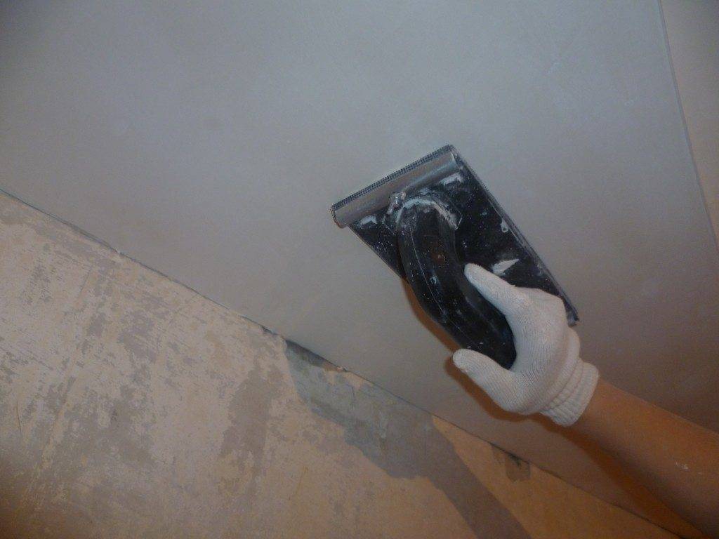 Вначале смачиваем поверхность потолка и даем воде впитаться, затем удаляем все лишнее шпателем.
