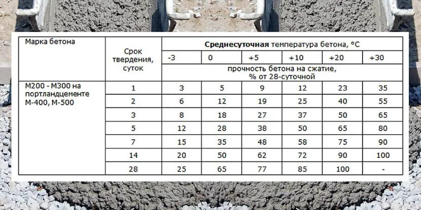 Принято считать, что бетон набирает марочную прочность лишь через 28 дней после того, как будет произведена заливка фундамента. Но это происходит только в определенных температурных условиях. Примерные данные можно посмотреть в таблице.