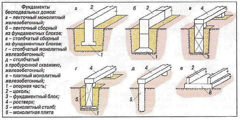 Выделяют несколько видов фундамента, отличающихся своей конструкцией: