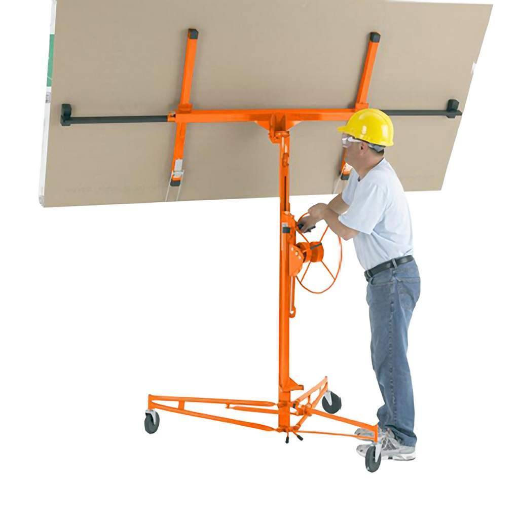 Устройство служит для крепления листов на высоте, и помогает при создании сложных конструкций из гипсокартона, деталей системы вентиляции или художественных архитектурных элементов. Например, подъемник позволяет транспортировать и ставить лист вертикально или горизонтально, надежно фиксируя его перед креплением к каркасу. Рамочное устройство имеет колеса для более безопасного и удобного перемещения плит, весит 20-30 кг, может поднимать листы весом до 50 кг на 3 метра. Устройство рассчитано на эксплуатацию одним человеком.