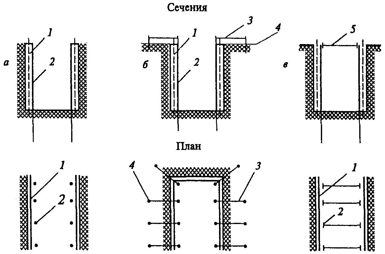 На сыпучих и плавучих почвах укрепление стен выемок осуществляется шпунтовым рядом. Это сплошная конструкция из деревянных планок и маячных свай. Согласно разработкам Мосинжпроекта, рамное крепление котлованов одновременно является и оградой при водоотведении от объекта.