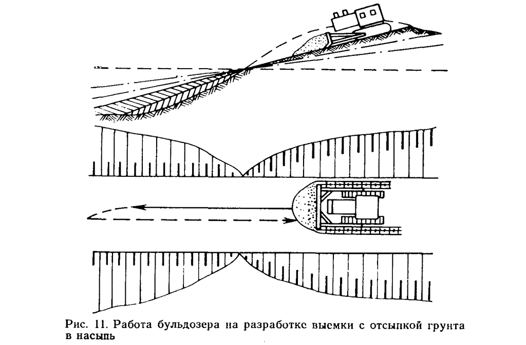 Сначала действия проводят в верхней канаве, нарезая небольшие уступы либо выполняя рыхление основания возводимой насыпи. Агрегат разрабатывает косогор, выполняя продольные проходы, действуя отвалом, угол захвата которого составляет 67°. Действие выполняют начиная с самой верхней границы косогора, затем постепенно перемещаются вниз, к полунасыпи.