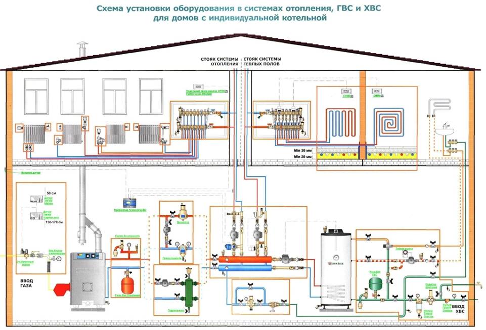 В данной схеме монтажа котла фильтр очистки воды установлен на точке входа питьевой в дом. ГДНК конструкционно не могут обеспечить интенсивную нагрузку ГВС, поэтому вполне достаточно обвязать 2—3 точки горячего водоснабжения.