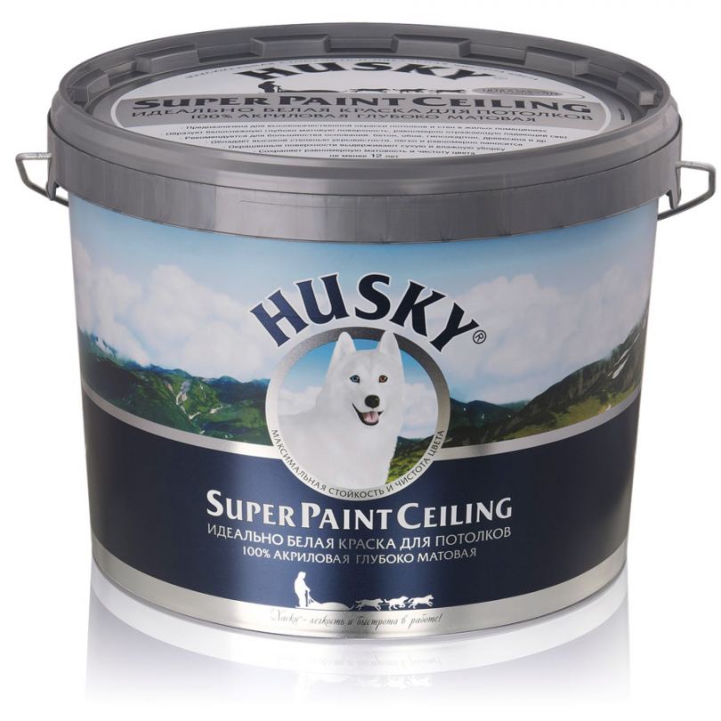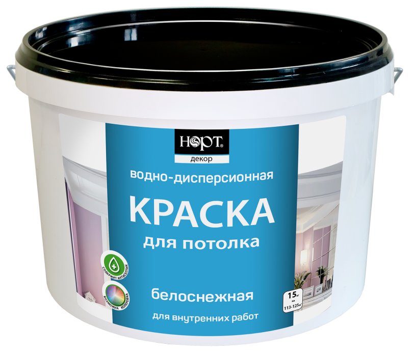 Краска образует полуматовый финиш при высыхании. Она очень стойкая и не истирается со временем. Густая консистенция позволит легко скрыть недостатки потолка и надежно закрасить их. Подходит для нанесения валиком или кисточкой, а вот для распылителя будет слишком густой. Ее можно использовать для любых помещений, в том числе и с повышенной влажностью и сыростью, так как краска обладает эффективным «дыханием» и не даст оседать конденсату и образовываться плесени. 1 литра краски хватит на 14 метров квадратных помещения. Краску наносят в два слоя, только с интервалов в 1 час. В продаже есть выбор объема: 4,5 и 9 литров.