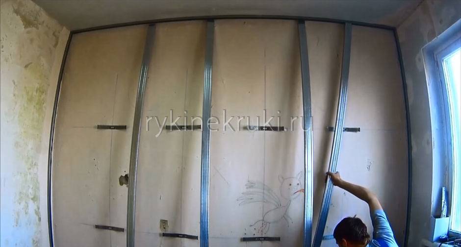 После создания каркаса пространство между профилями утепляется (при необходимости) и обшивается гипсокартоном.