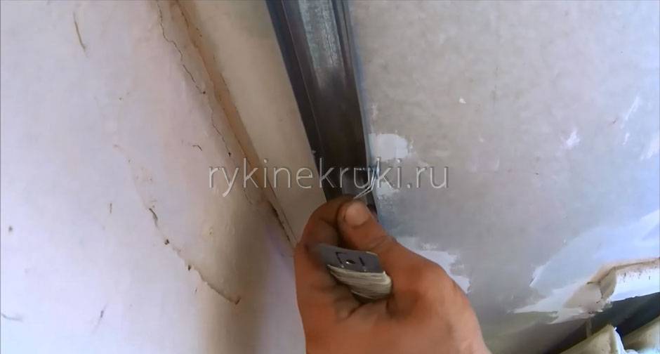 Сторона направляющего профиля проклеивается посредством уплотняющей ленты. Профиль монтируется на поверхность стены пластиковыми дюбелями-пустышками и шурупами с диаметром 5 мм, при этом нижняя часть конструкции должна находиться на линии. Далее следует крепление с расстоянием в 0,4 или 0,6 м. посредством анкерных дюбелей. Потолочные профили нарезаются и вставляются в направляющие и подвесы. С помощью направляющей нити или уровня их выставляют строго горизонтально.