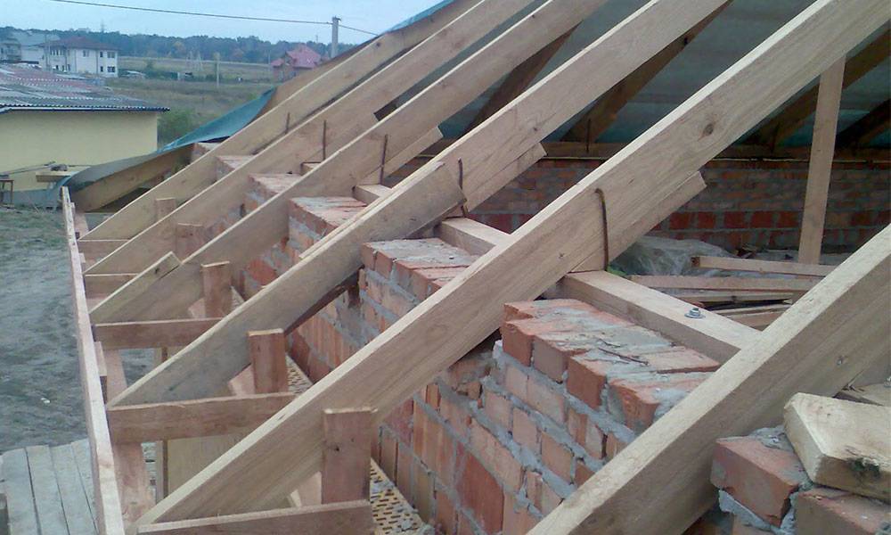 В отдельный случай можно выделить фронтоны крыши, сделанные, как и стены, из кирпича. Подобный метод разгружает и общую массу кровли, и её нагрузку на конструкцию. Мауэрлат выполняется исключительно на боковых стенах. Ещё его можно зафиксировать в проёмах, предусмотрительно сделанных внутри фронтонов. Они способны брать долю нагрузки, создаваемую боковыми усилиями. Мауэрлату при кирпичной стене стоит находиться ближе к её внутренней стороне, при этом не давая давления на внешний, несущий функцию украшения, слой кладки.