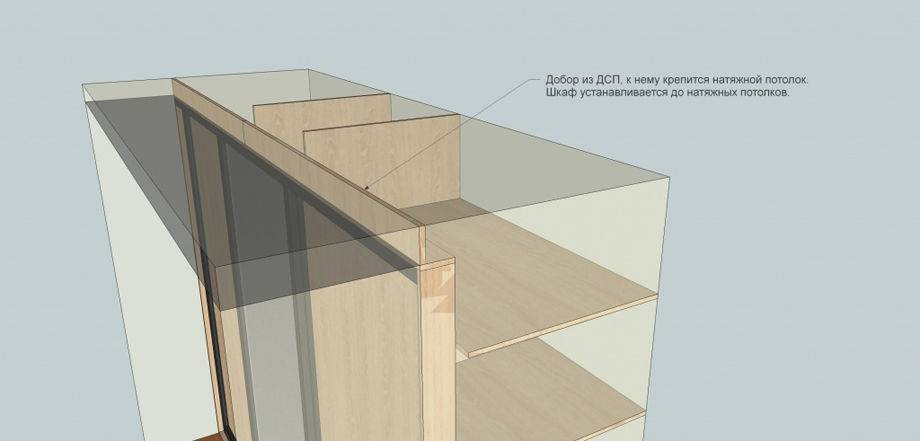 При установке обычной мебели ремонт проводят по правилу сверху вниз. Поэтому сначала натягивают ПВХ-пленку, затем украшают полотно края, покрывают стены и пол. Затем собирают, устанавливают шкаф. В случае встраиваемой модели установка выполняется с учетом способа крепления потолка.