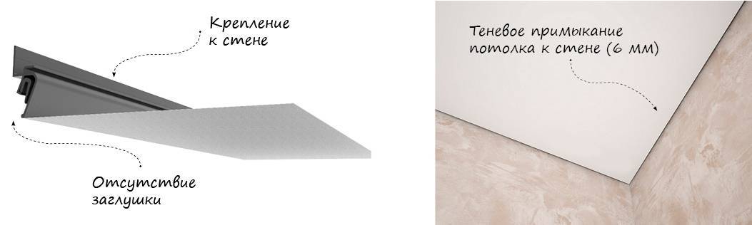 Наличие зазора дает особый эффект — он отбрасывает тень на стену, что и стало причиной наименования конструкции. Для усиления эффекта обычно прибегают к небольшой хитрости — участки стены и другие элементы, которые можно рассмотреть в зазоре (как правило, это несущая конструкция — багет) окрашиваются в черный цвет.