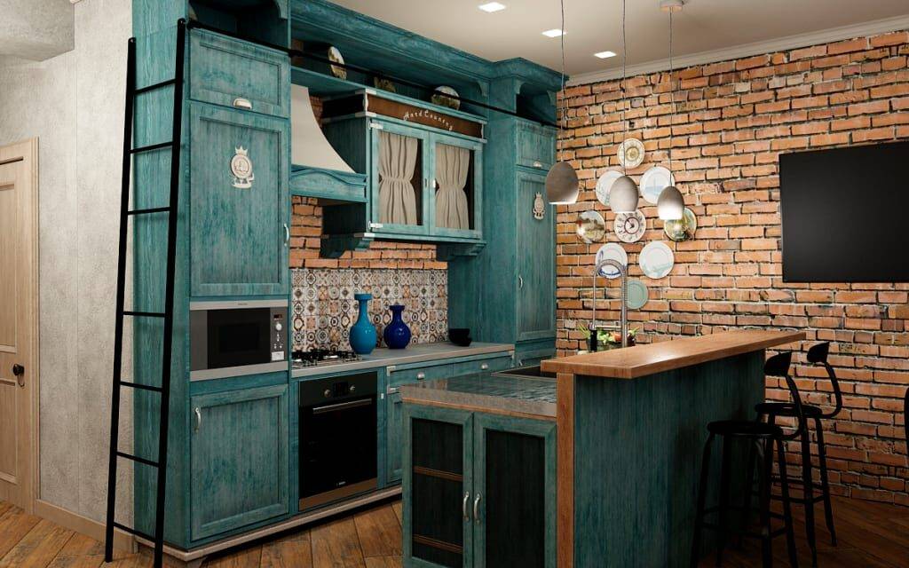 Синяя кухня в смешанном стиле: лофт, классика, современность.