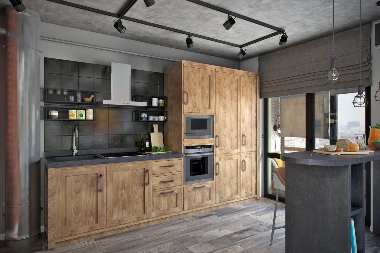 В «промышленном» направлении никак не обойтись без серых тонов, которые присутствуют как в полированной стали современной техники, так и в фасадах гарнитура, массивной каменной столешнице, бетонных стенах. Серый тон сам по себе нейтрален и ненавязчив, он отлично сочетается с любыми другими красками и вполне может служить основным цветом отделки стен и пола. Применение различных оттенков пепельной палитры позволяет сделать нужные акценты в интерьере.