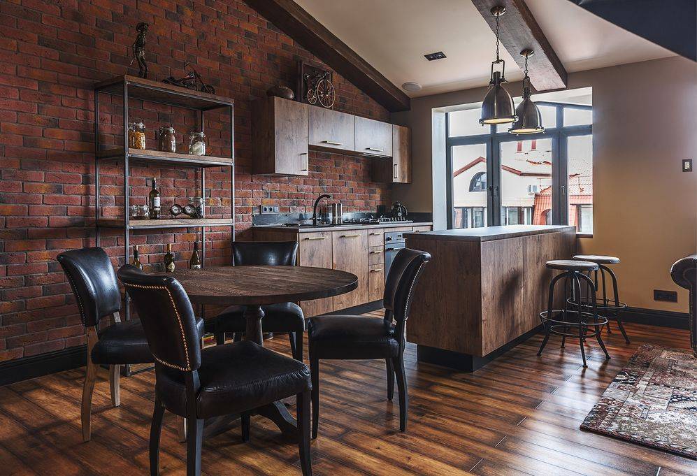В просторной кухне будет отлично смотреться стол из массива с мягкими стульями с высокой спинкой. Каретная стяжка, которая знакома нам как частый элемент классических и изысканных интерьеров, отлично уживается с индустриальными мотивами.