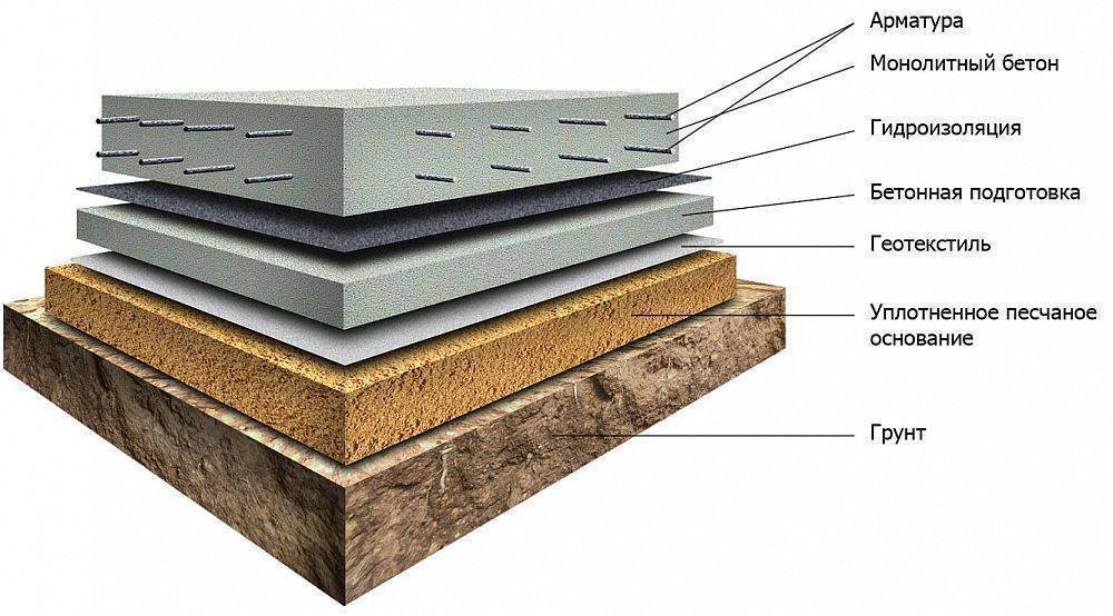 Плитный фундамент имеет в основе плоскую железобетонную опору. Возводятся основания такого вида на слабых, пучинистых и неоднородных почвах, где содержатся грунтовые воды.