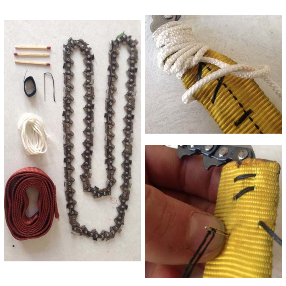 Далее нужно пришить ручки самодельной ручной пилы при помощи вощеной льняной нити. Прошивать вокруг цепи нужно наиболее плотно, чтобы она не выскальзывала из лямки. Стоит обернуть второй край лямки вокруг кисти, для формирования довольно большой петли для вашей руки.
