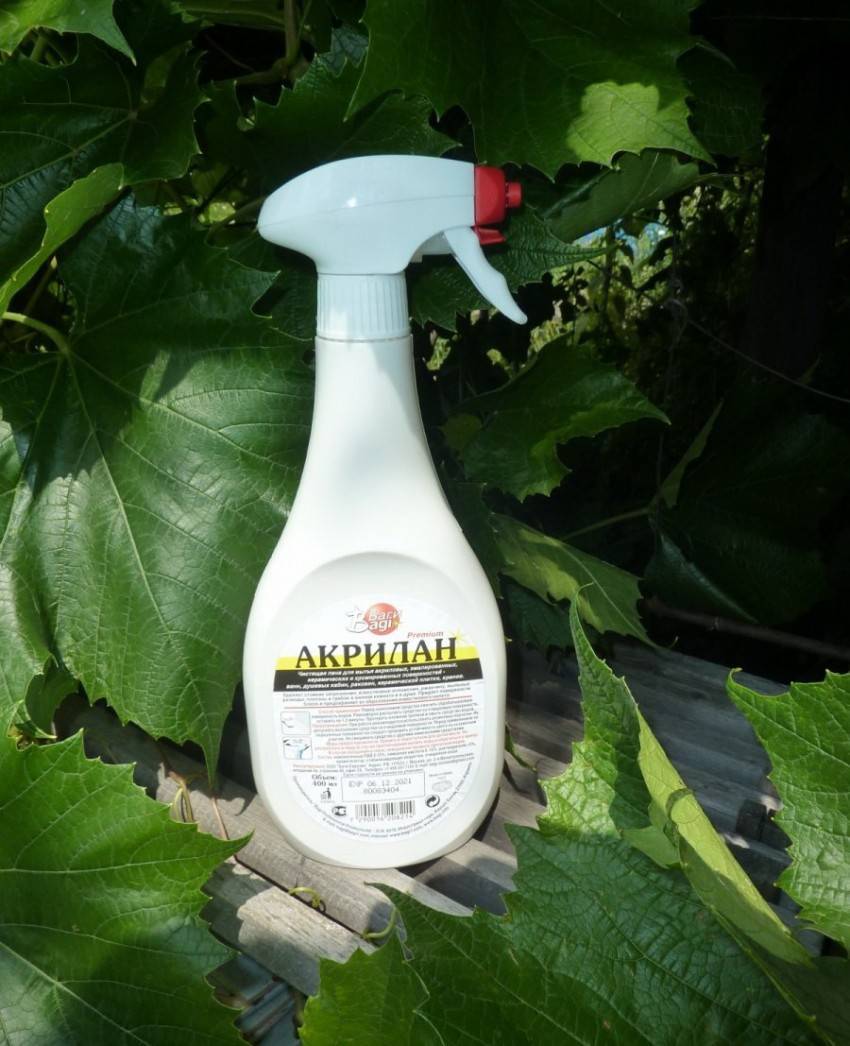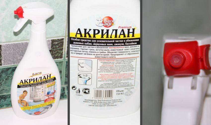 Следующее чистящее средство – Акрилан от компании Bagi. Этот продукт представляет собой пену, которая тщательно, но бережно удаляет с акриловой поверхности ванны не только грязь, налёт извести, ржавчину и въевшиеся пятна, но и микробы, а также плесень и грибок. Подходит также для стёкол, плитки, керамики и эмали. По окончании работы данный состав образует особую плёнку, не позволяющую скапливаться грязи и налёту в течение нескольких дней.