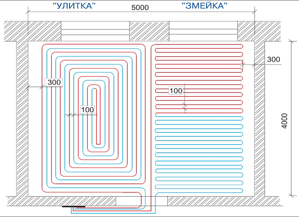 Возможны следующие варианты раскладки: змейкой, двойной змейкой и улиткой. При выборе схемы надо учитывать размеры, конфигурацию помещения и расположение наружных стен